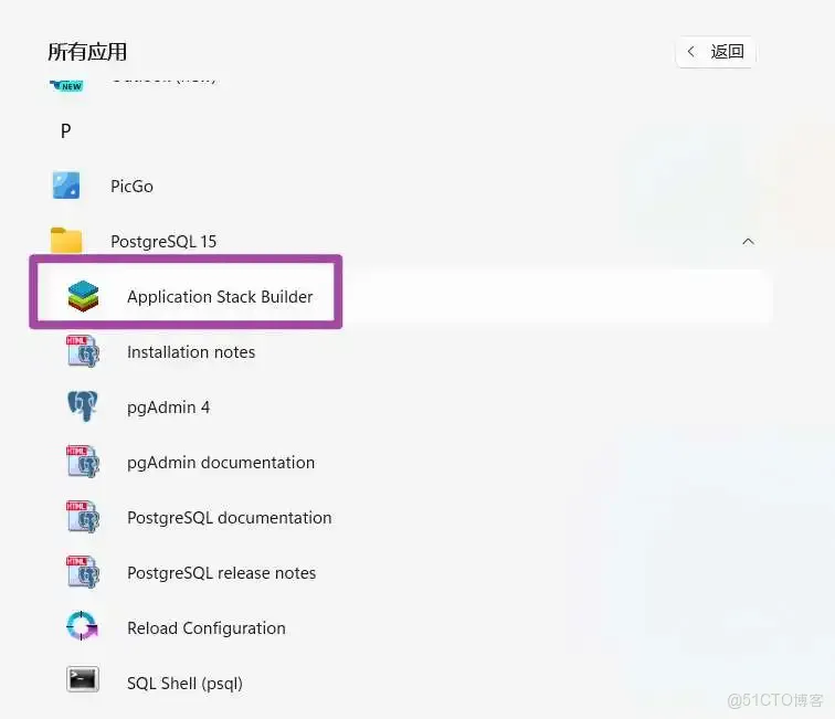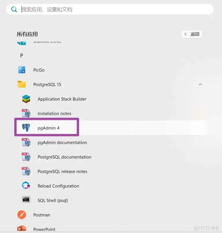 隨後,在開始菜單中的應用列表中,在PostgreSQL XX文件夾中,找到並打開pgAdmin 4這個軟件,如下圖所示。