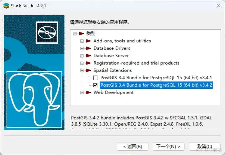 隨後,在選擇需要安裝的應用程序時,在如下圖所示的位置找到PostGIS,並安裝新版本(版本號高的那個)即可。
