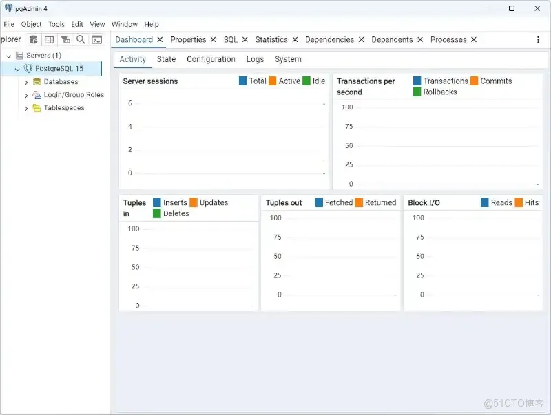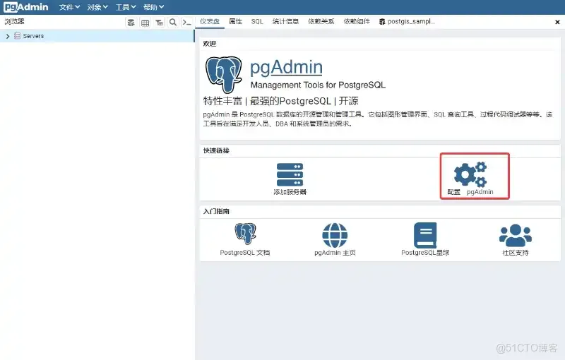 如果出現如下圖所示的界面,表明我們本機的PostgreSQL已經下載、安裝完畢,並且已經成功運行了PostgreSQL服務,且可以通過pgAdmin 4工具訪問本地的PostgreSQL數據庫了——在Windows下,PostgreSQL安裝完畢後默認自動啓動。
