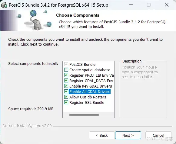 接下來,在安裝PostGIS時,又需要選擇一下安裝的項目,大家如果沒有別的特殊需求,按照下圖所示的勾選方式來安裝即可。
