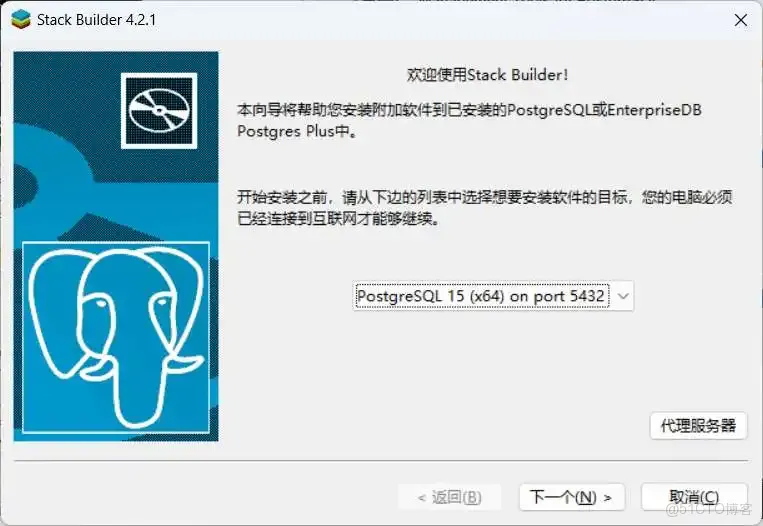 如果大家後面還需要安裝PostGIS拓展,或者是其他PostgreSQL的拓展的話,建議就勾選上圖中的勾選框。勾選之後,會在關閉PostgreSQL安裝程序後,自動打開Stack Builder窗口,如下圖所示;這個Stack Builder就是用來安裝各類PostgreSQL的拓展的。打開這個Stack Builder界面之後,先不用管他,往下繼續看本文即可。