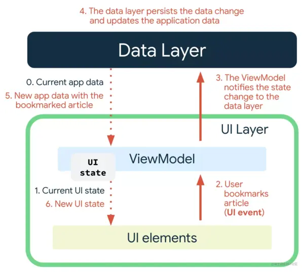 舉個例子,如果用户需要給新聞列表加個書籤,那麼就需要將事件傳遞給ViewModel,然後ViewModel更新UI State(中間可能有數據層的更新),UI層訂閲UI State訂響應刷新,從而完成頁面刷新,如下圖所示: