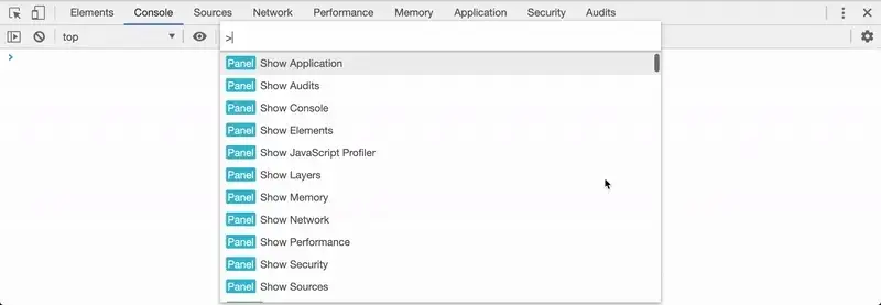 在Devtools打開的情況下,鍵入cmd + shift + p將其激活,然後開始在欄中鍵入要查找的命令或輸入"?"號以查看所有可用命令。