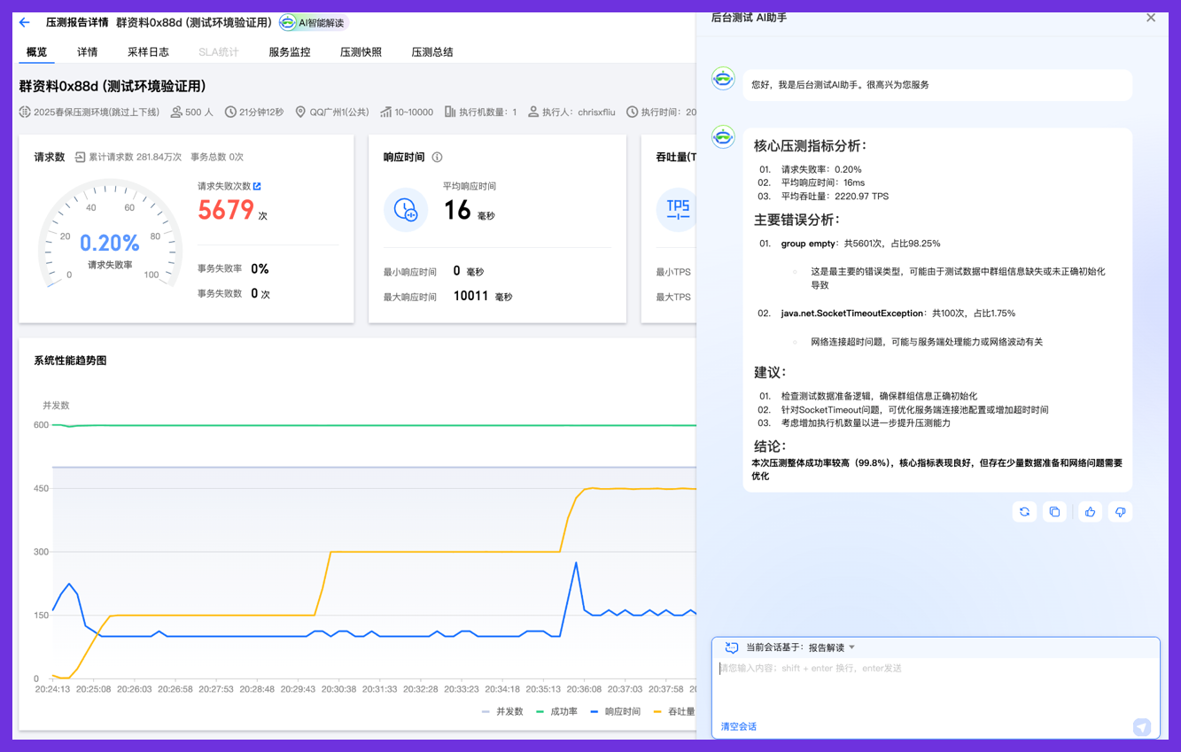 支持百萬級併發、億級QPS吞吐的大規模壓測,多種壓測模型可模擬真實用户的“峯谷波動”,AI結合壓測各性能指標統計結果,智能評估被測場景的穩定性,錯誤原因分析,並提供後續優化建議。