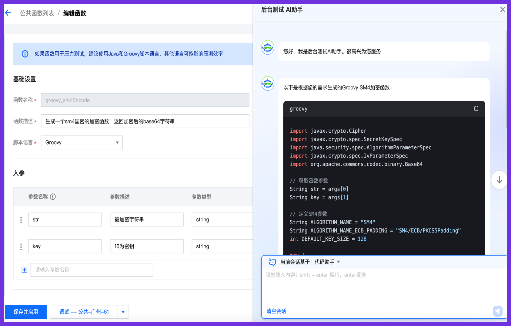 不想手動搭建?一鍵召喚內置AI助手,通過自然語言描述生成測試場景,可直接預覽並調試。
