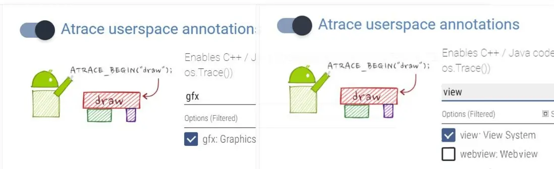 Perfetto有一些配置,針對畫面抖動問題需要確認開啓ATrace的gfx、view模塊: