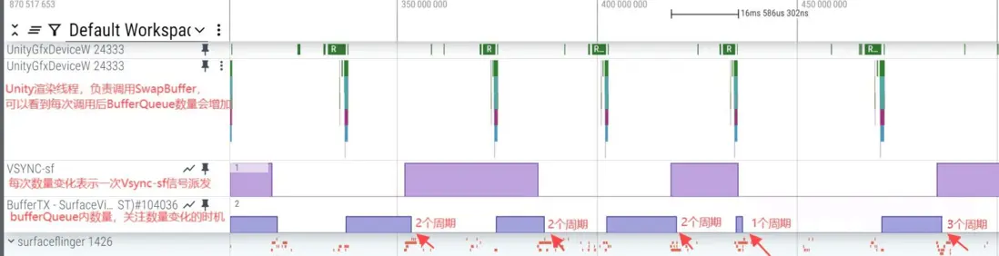 這裏篩選出了Trace數據中相關的軌道,從BufferQueue裏面可以看到大多數情況是2個週期消耗一次,偶爾會有1、3個週期出現。