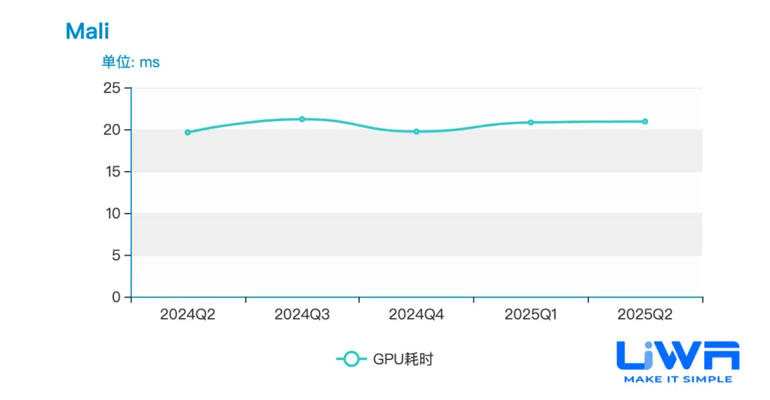 GPU耗時表示GPU處於工作狀態的時間,我們在這個方面迭代了大量的計算版本來提升改數值的精準性。雖然由於GPU可以在不同的頻率下工作,工作時間並不直接反應工作壓力,但該數值仍可以針對不同的芯片來進行較為精準地反饋,下面是Mali芯片和Adreno芯片上該指標的性能趨勢。