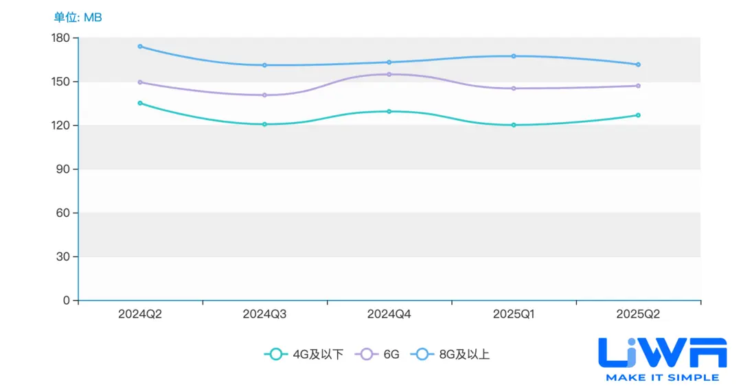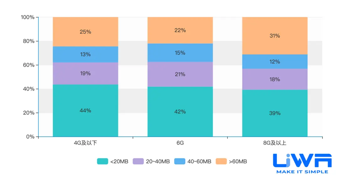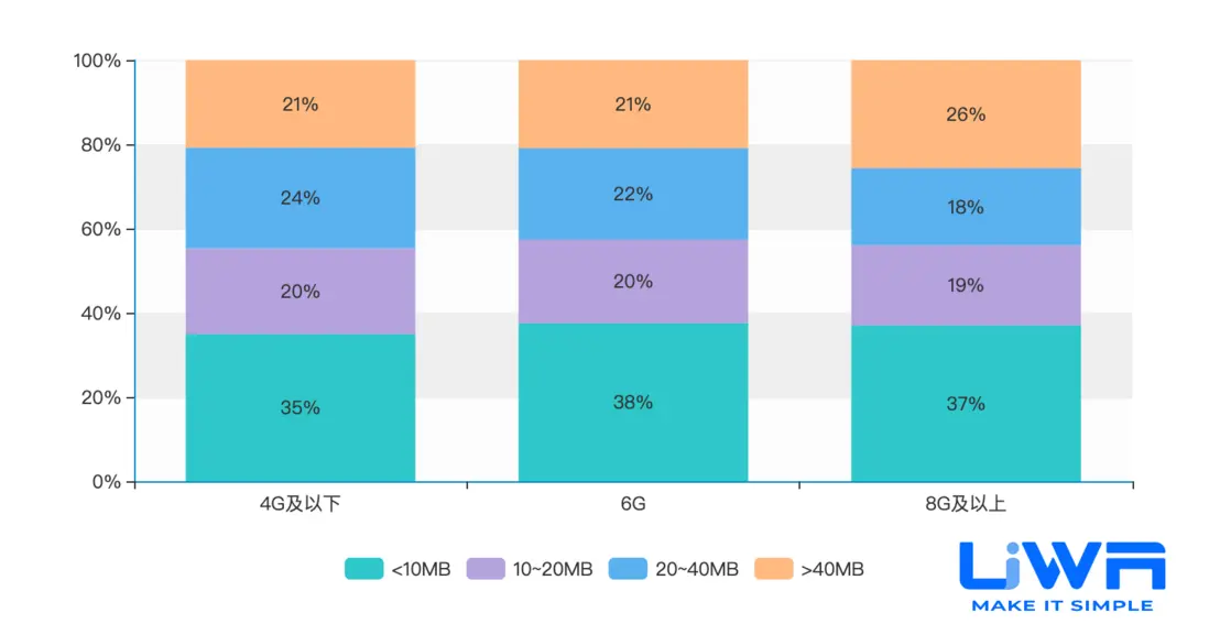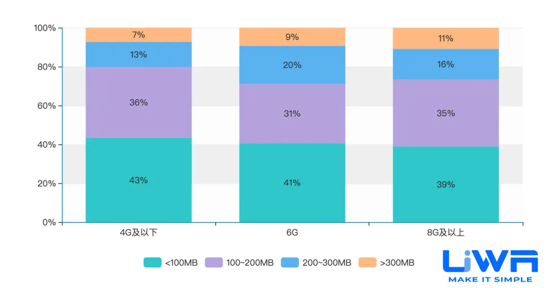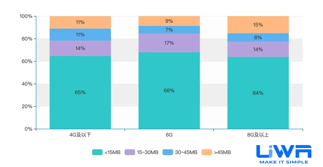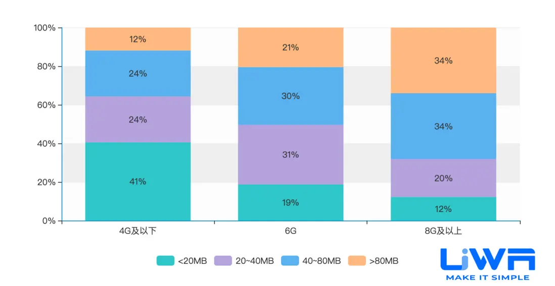 4GB內存以下設備的內存佔用(中位值)在1.1GB-1.3GB之間,4GB內存以上設備的內存佔用在1.2GB-1.6GB(中位值)之間,且無論是低端、中端還是高端,整體趨勢較為平穩。