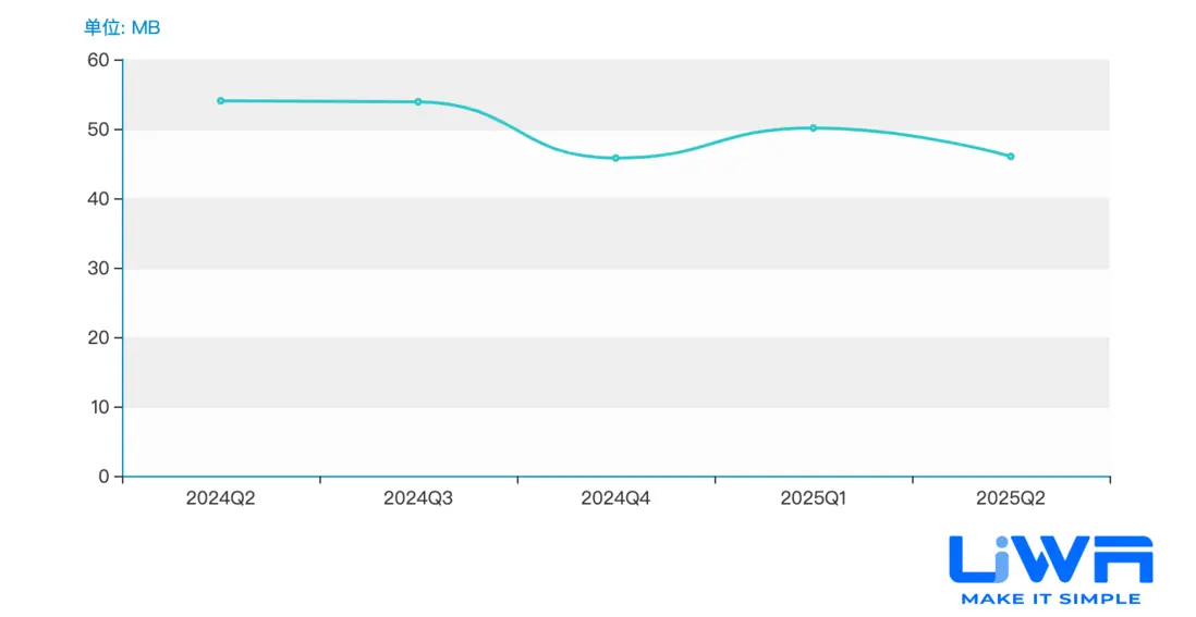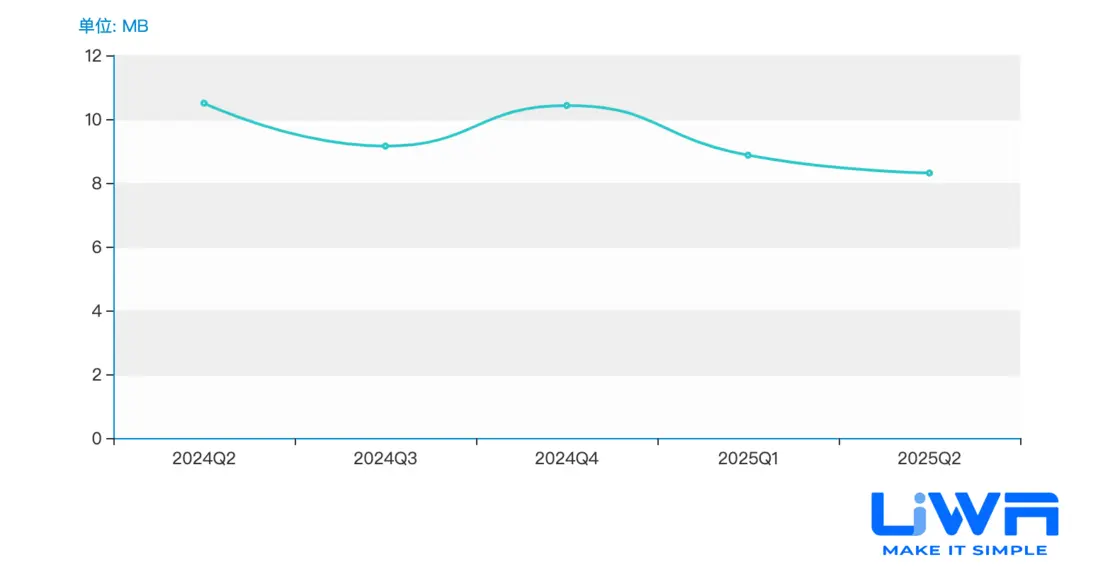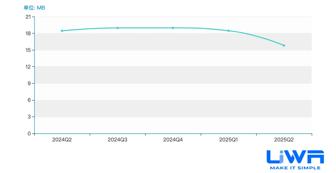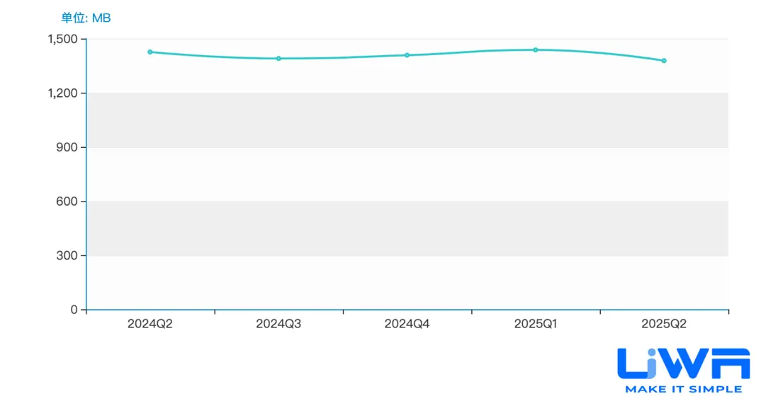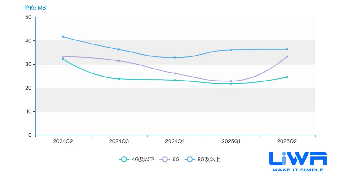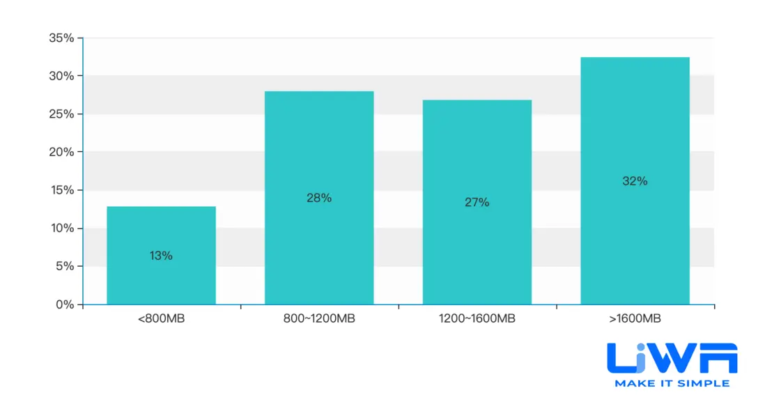 4GB內存以下設備的內存佔用(中位值)在1.1GB-1.3GB之間,4GB內存以上設備的內存佔用在1.2GB-1.6GB(中位值)之間,且無論是低端、中端還是高端,整體趨勢較為平穩。