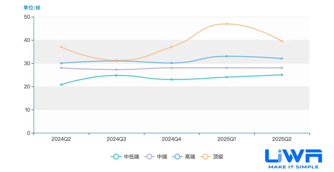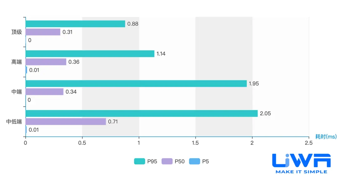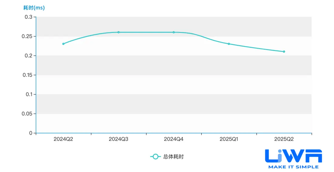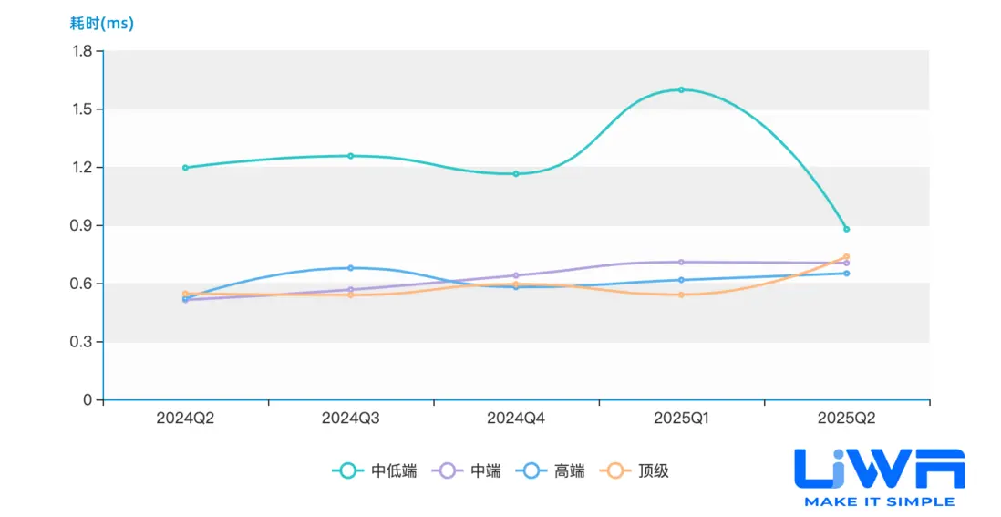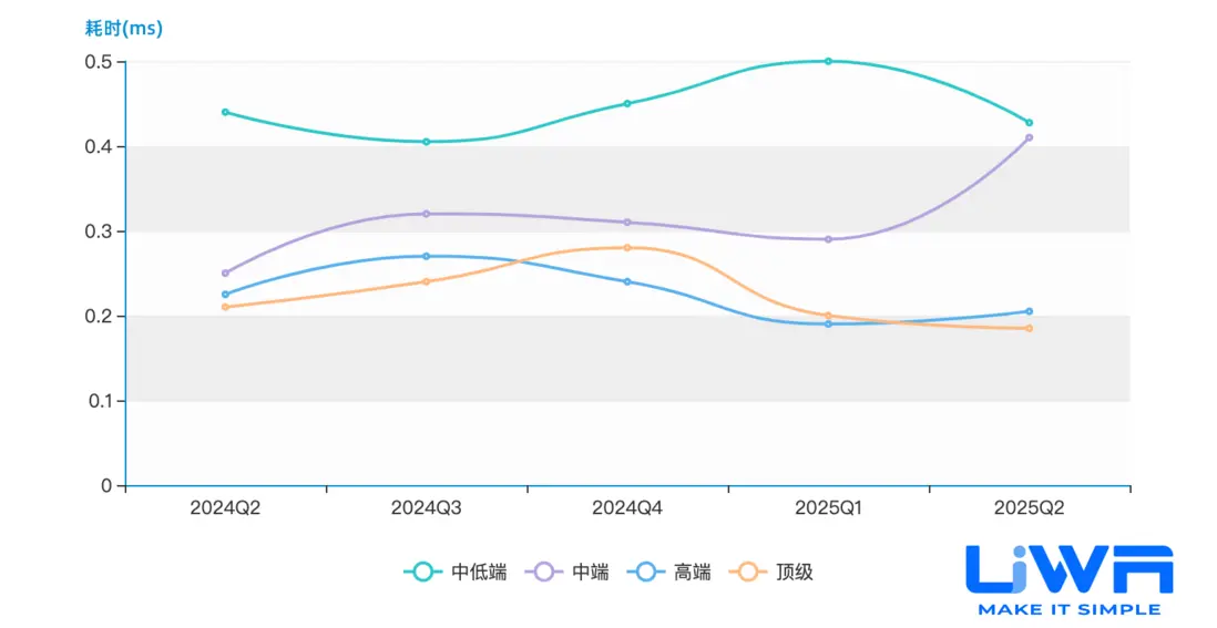 除了中低端設備,其他檔次設備的動畫性能的趨勢表現都較為平穩,説明大家對於動畫模塊的使用較為合理的。除了中低端設備以外,動畫模塊的性能耗時在2025年Q1均有所上漲。