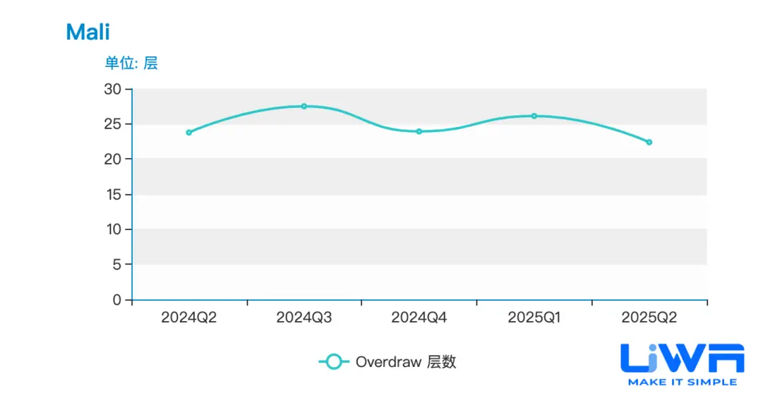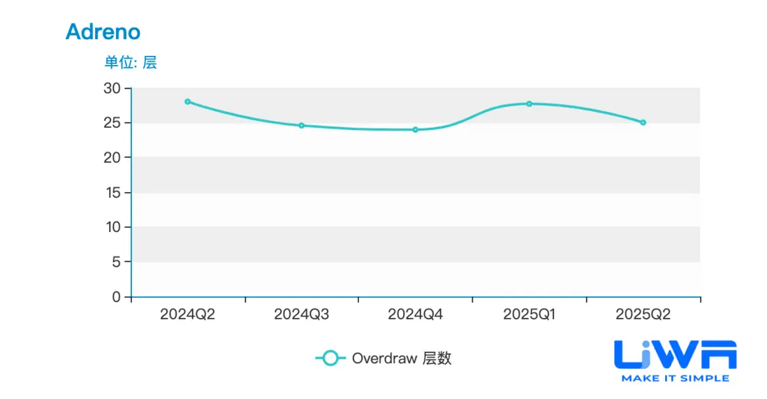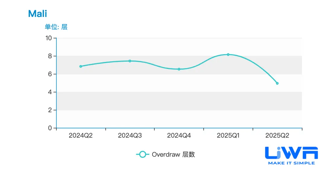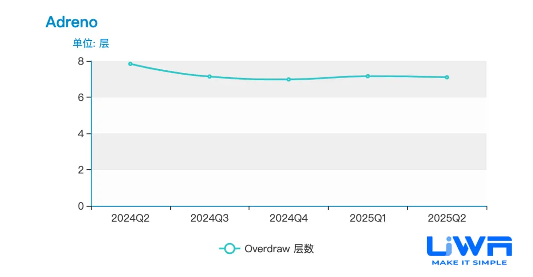 在最近一年的移動遊戲測試中,無論是Mali芯片還是Adreno芯片,其Overdraw層數基本上都維持在4~8層左右,如下圖所示。