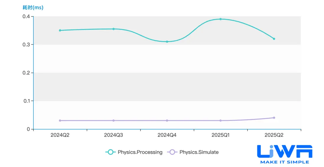 物理模塊的整體耗時相對比較平穩,這得益於越來越多的研發團隊對於物理引擎開啓的必要性做了更深入的瞭解。