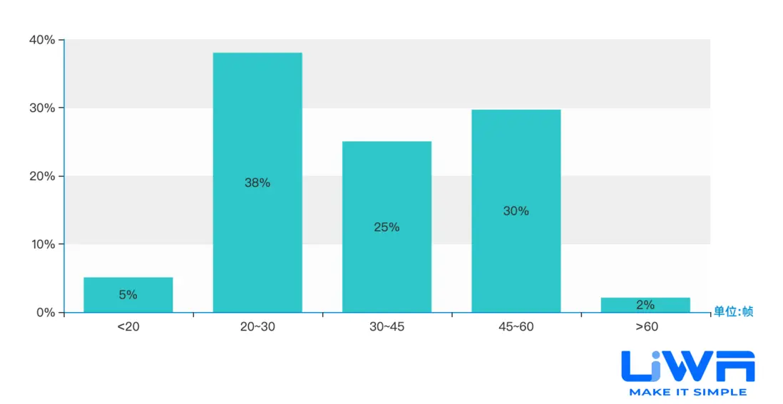 從已有的FPS均值總體測試數據來看,有38%的項目幀率在20-30幀之間,25%的項目在45-60幀之間。説明大部分的項目還是趨於30幀的目標做優化,但同時也説明目前已經有較多項目開始以60幀為目標進行遊戲開發,高端設備(非頂級)上已經有近30%的項目以60幀作為目標。
