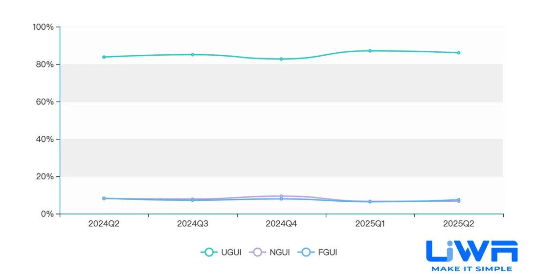 目前我們主要統計了NGUI、UGUI和FGUI的佔比情況。三種UI解決方案在這一年中,總體走勢都較為平穩,UGUI依然是壟斷地位,最高時可達86%;同時,NGUI或FGUI的使用比例均為7-8%。