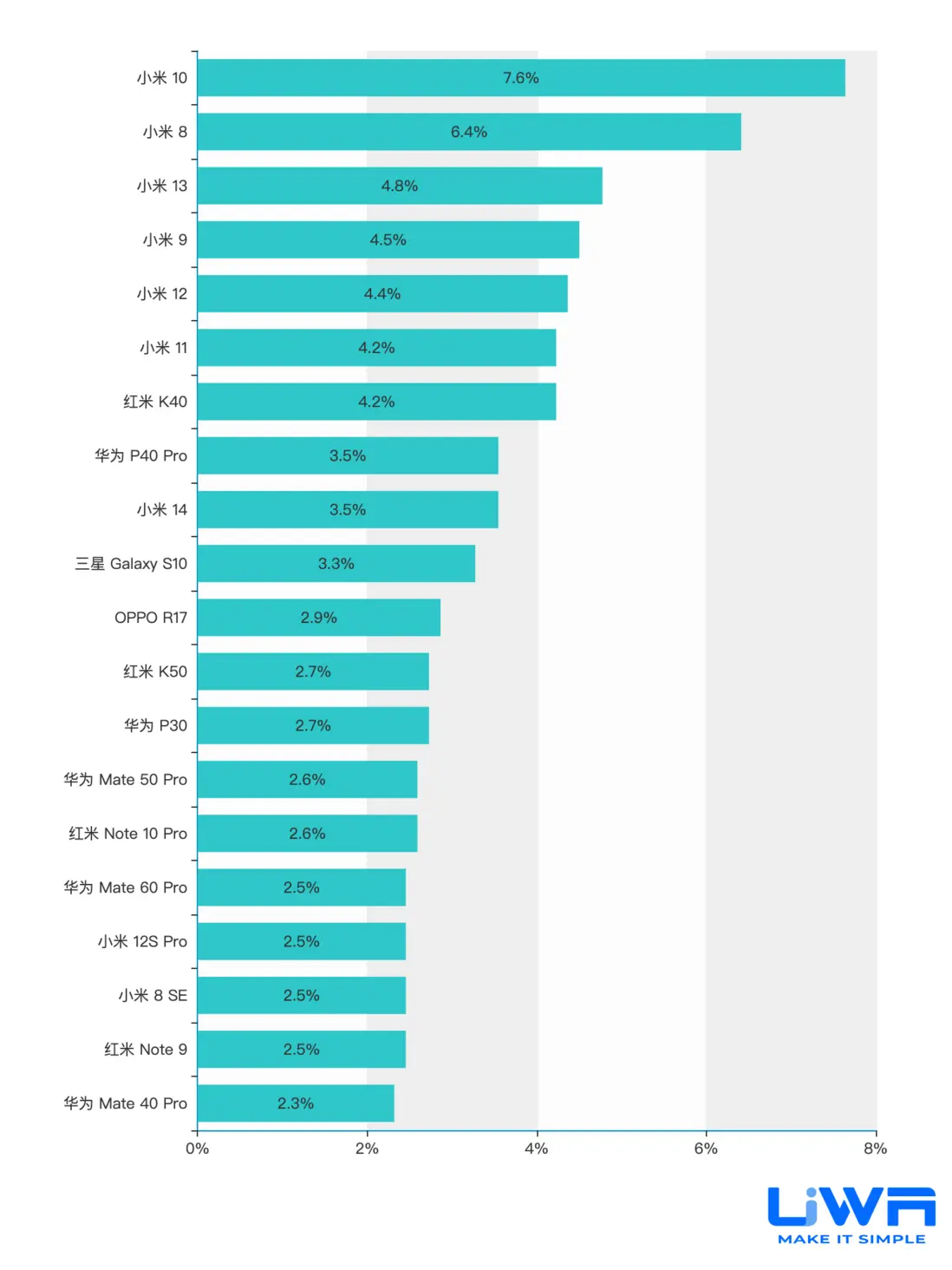 • 小米品牌以絕對性優勢在測試機型中拔得頭籌,Top 3機型分別為小米 10、小米 8和小米 13;