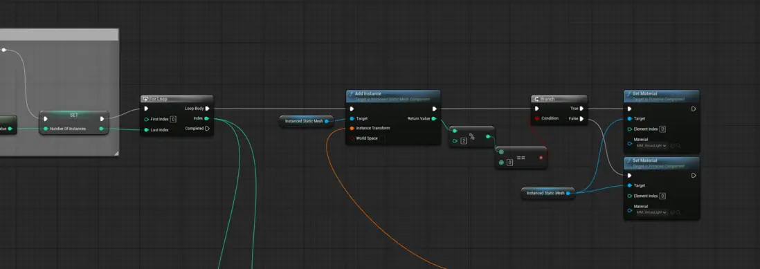 A:因為你用了InstanceStaticMesh,只能有一個網格和一個材質,所以無論如何分配材質只會給到組件上的所有實例。要想實現所説的效果有以下幾種方法:<br/>