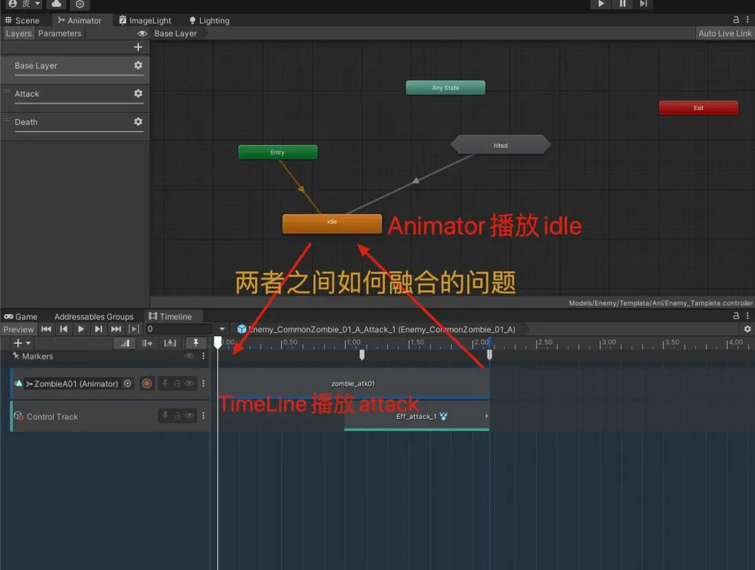 感覺Timeline和Animator之間好像沒有融合,他們的融合是獨立的:Animator播放Idle,Timeline播放Attack。
