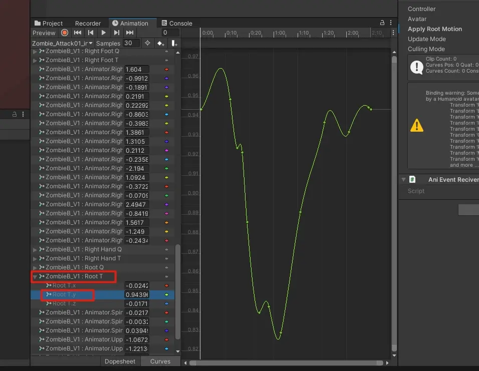 A2:我用了一個奇招解決了,在Unity中,對FBX動畫文件裏的Animation複製一份出來,此時就可以使用Unity的編輯器直接編輯動畫了,找到它對Root節點的動畫控制,刪除掉,就正常了: