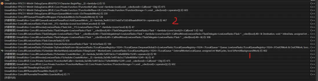 下圖中1的位置是Worker線程取Task,2的位置是執行InQueuedWork->DoThreadedWork(),終於又回到了線程池。
