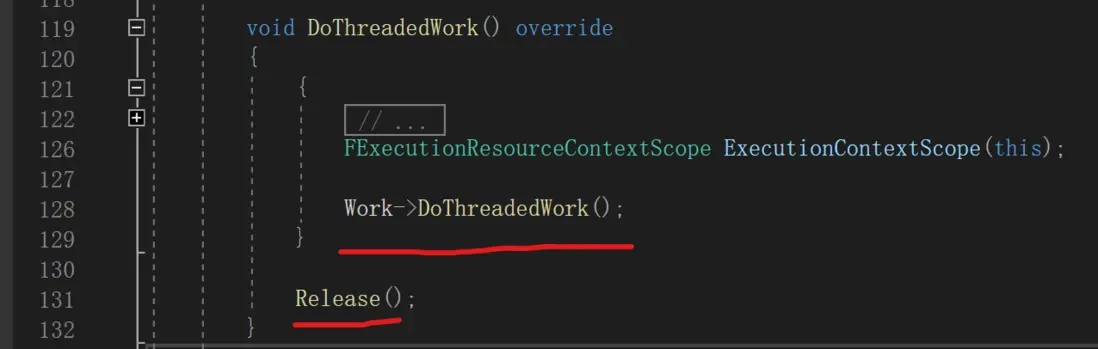 FScheduledWork執行完DoThreadedWork後,會調用Release,繼續讓線程池執行剩餘任務,並把自己重置,加入WorkPool中,等待下次使用。