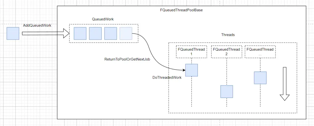 不是真正的線程池,而是另一個線程池的包裝,任務都會轉發過去。UE5 Editor下GThreadPool就會設置成這個,包裝了GLargeThreadPool,目的為共用GLargeThreadPool中的線程,類似FQueuedLowLevelThreadPool共用TaskGraph的線程,因為Editor下後台任務更多,因此單獨使用了GLargeThreadPool。這麼做的目的還是減少線程創建。
