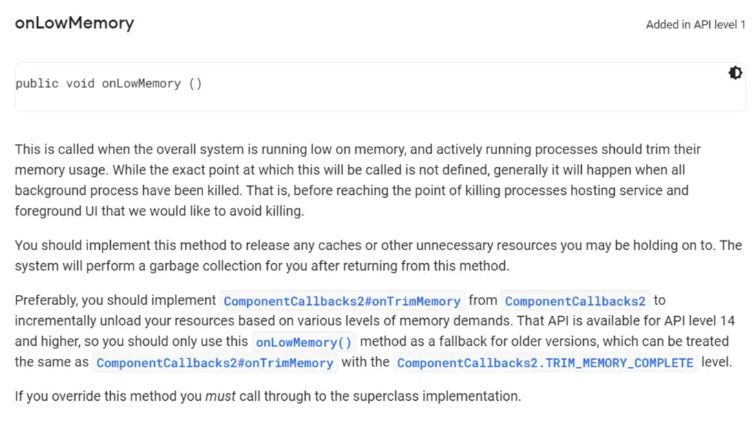 上圖説的是系統內存不足會觸發,通常是在所有後台進程被殺死時候(但是也説了沒有明確的觸發時機,只是通常是所有後台進程被殺死)。