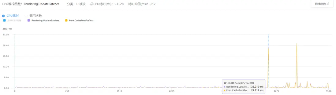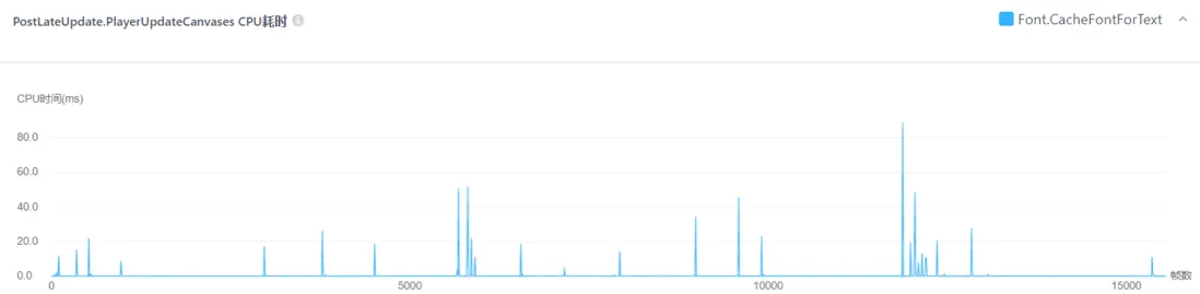優化後優化後之所以還是存在部分Font.CacheFontForText的耗時峯值,是因為在測試後期又渲染了之前FontTexture中沒有的字符。