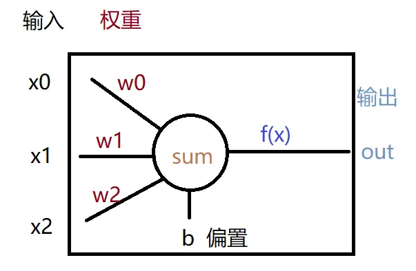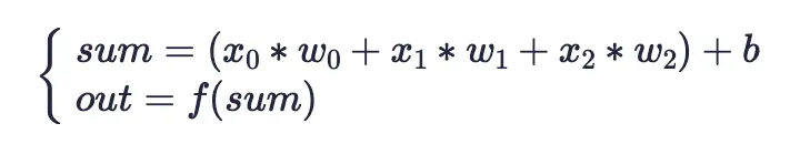 將傳入感知機的多個輸入x,與對應的權重w相乘(輸入的數量與權重的數量是一樣的,且數量是任意的,本例中用了3個),再加上偏置b就可以得出一個計算值sum。再將這個計算值傳入一個函數f(x)就可得到感知機的最終輸出out。