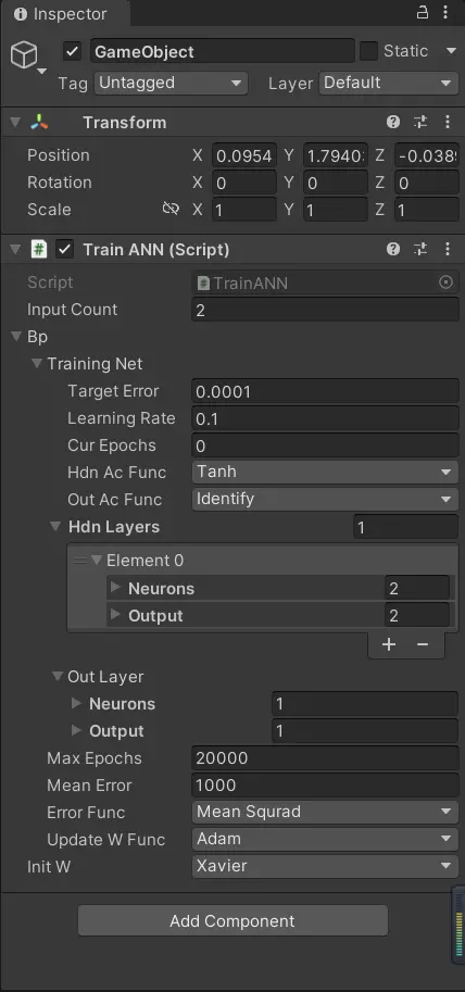 將它掛載在場景的任一物體上,不出意外的話,你可以在編輯器看到神經網絡類的許多關鍵變量都可以顯示出來(如果你的沒有,就要注意是否遺漏[System.Serializable]或設置成了私有類):