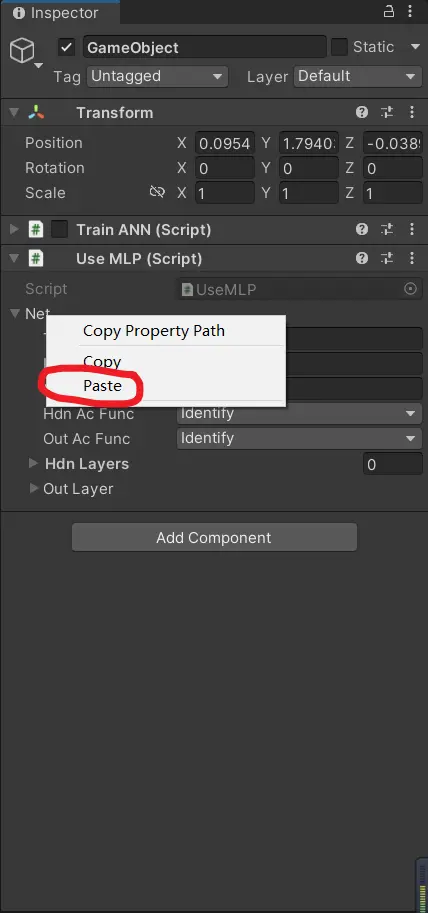 可一旦結束Unity運行後,編輯頁面這些被訓練好的參數就又變回去了,這該怎麼辦?很簡單,一旦訓練完後,就暫停運行(是暫停,不是結束),右鍵神經網絡的名字,將它複製下來。