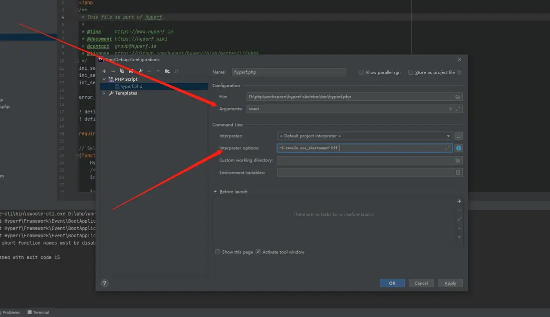 - 打開項目的啓動配置 可以配置參數和運行環境的一些參數 我這配置了關閉swoole的短命名