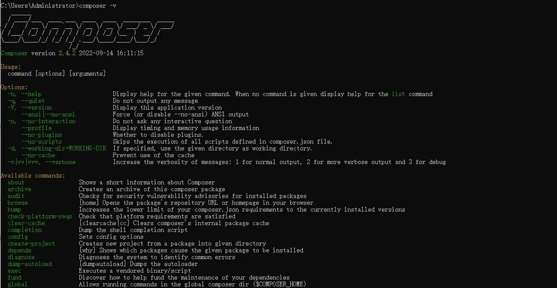 php -r "copy('https://install.phpcomposer.com/installer', 'composer-setup.php');" php composer-setup.php php -r "unlink('composer-setup.php');"- 接着新建composer.bat到bin目錄下寫入內容至文件,運行composer -v 查看是否運行成功