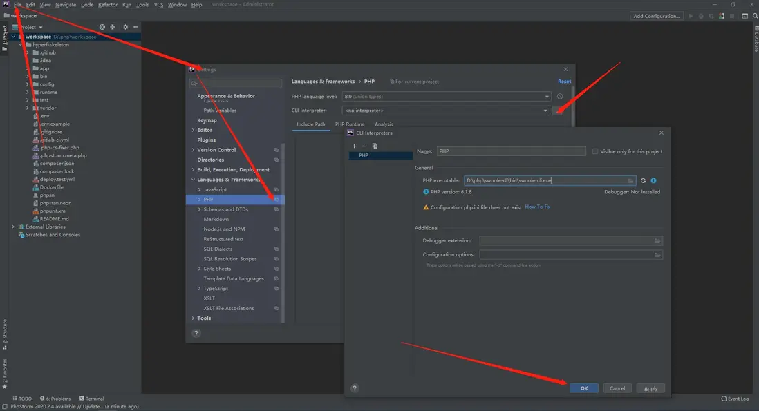 - 設置其實是相當簡單 file-settings-languages && framewors-php -設置cli的路徑-提交
