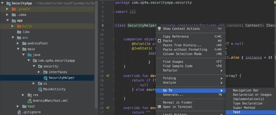 步驟2方式一:在對應模塊-src-test-java下,添加一個kotlin或java的類SecurityHelperTest,我這裏是kotlin的語言