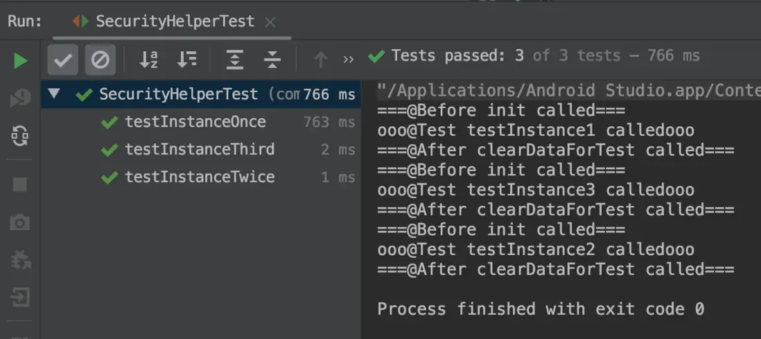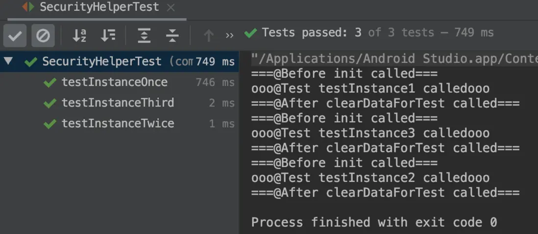 這裏是SecurityHelperTest的完整代碼,我們分別使用一遍assertNotNull/assertSame/assertEquals三個斷言方法,用於測試這個加解密單例代碼,第一次調用是否不為空,第二次調用是否同一個實例對象,第三次調用是否實例的類名字相等。