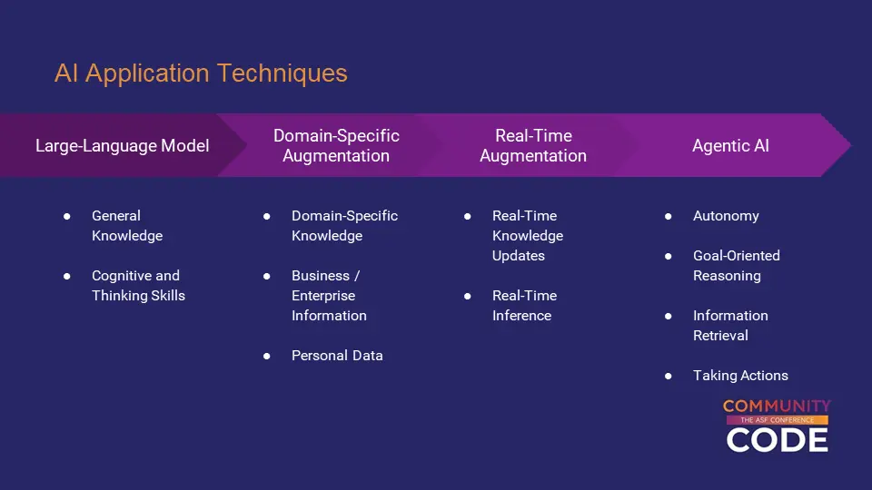 當前AI應用技術的發展可以分為四個主要層次。第一層是基礎的模型調用能力,這是所有AI應用的基礎。第二層是領域增強技術,通過專業知識的注入讓AI在特定領域具備更強的專業能力,而不再是一個通用的智能系統。