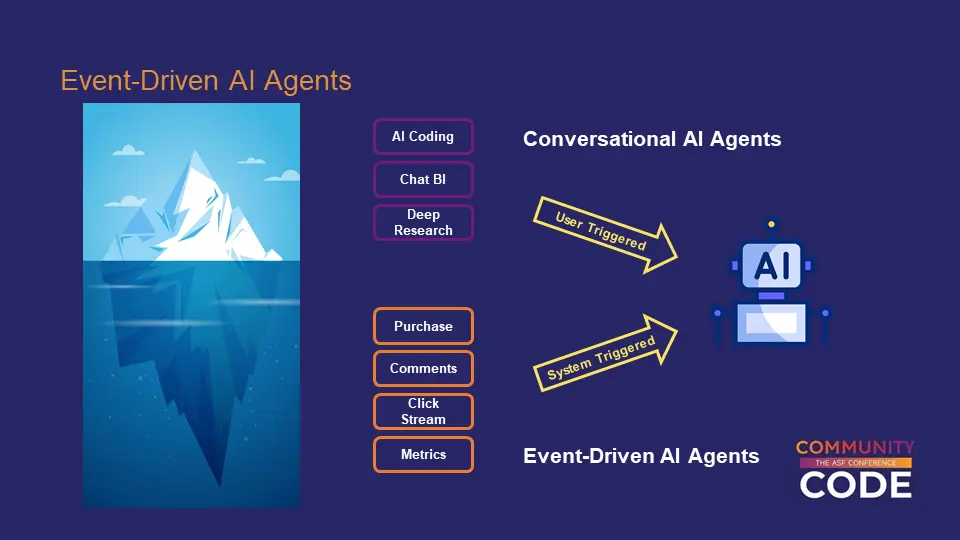 與之相對的是事件驅動(Event-Driven)智能體,這種應用由系統自動產生的實時事件或數據更新來觸發AI的處理過程。隨着AI技術的發展和成熟,未來智能體的發展方向必然是工業化的,也就是説會有更多的AI請求由系統自動觸發,而不需要人工手動操作。這個趨勢就像數據分析領域的發展歷程一樣,從最初的人工編寫SQL查詢,發展到今天大量的OLAP分析都基於模板自動生成,能夠達到每秒數百QPS的處理能力。