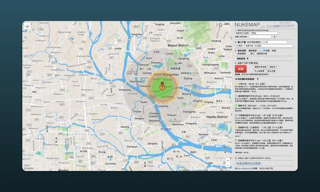 這個網站用來模擬核彈爆炸的影響,你可以選擇任意地點,然後選擇某個型號的核彈,看看附近會有什麼影響。