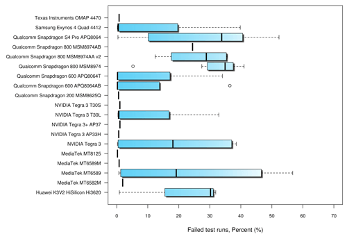 The findings from this study are plotted on graphs. In those graphs, the dark black line is the median (50%) of the failure percentage of different devices in that group. The lines above the bars mark the upper quartile (75%), and the lines below mark the lower quartile (25%). The dashed lines are the maximum (top or right) and minimum (bottom or left). The circles represent outliers.