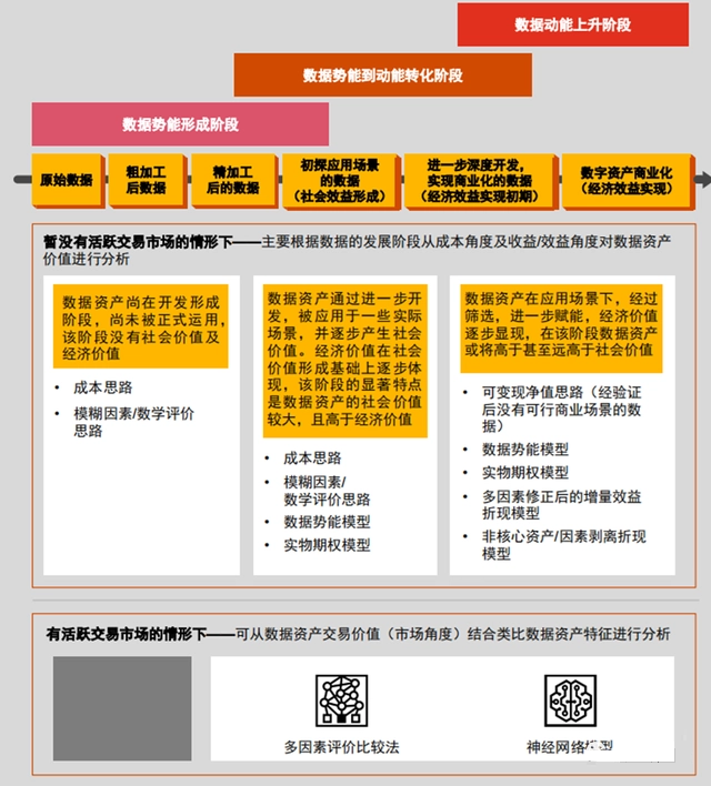普華永道結合數據資產的特徵和發展階段提出了數據資產估值的框架體系,認為在暫沒有活躍交易市場的情形下,主要根據數據的發展階段從成本角度及收益/效益角度對數據資產價值進行分析;在有活躍交易市場的情形下,可從數據資產交易價值(市場角度)結合類比數據資產特徵進行分析。