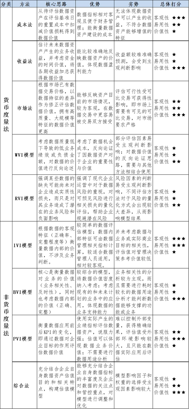 貨幣度量的估值方法以傳統資產評估方法為代表,主要包括成本法、收益法以及市場法三大類,此外還包括由Gartner提出的浪費價值(WVI)和風險價值(RVI)兩種貨幣類評估模型。非貨幣度量法主要包括Gartner提出的內部價值(IVI)、業務價值(BVI)和績效價值(PVI)三類模型,分別從數據的內部特徵、業務價值和績效的角度進行評估,同時也涵蓋實踐中各類參數形成的綜合評估體系。具體如下表: