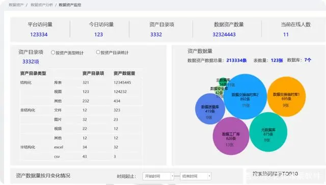 平台提供多種維度的資產監控,並以直觀的圖表展現,便於一目瞭然把控數據資產情況。系統按照資產類型、資產目錄對資產個數、資產數據量進行統計,也提供根據 不同的數據庫統計資產數據量,按月統計資產的變化量等統計維度。
