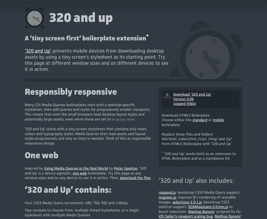 320 and Up works on the “tiny screen first” principle, whereby designs are created for mobile screens first, and then expanded for tablets, desktops, and large screens. It works well as an extension to HTML5 Boilerplate and as a standalone kit.