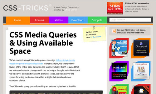 A tutorial from CSS-Tricks that discusses how to make subtle changes with media queries and how to use media queries in a single style sheet. For instance, if you have a fluid-width design in which the sidebar is 35% of the width of the page, depending on the width of the browser window, you could say, “If the browser is really narrow, do this. If it’s wider, do this. If it’s really wide, do this.” In the article, you’ll learn how to modify a list of links according to the browser’s viewport.