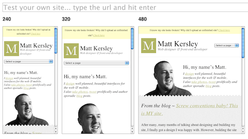 This tool is for everyone who needs a quick and easy way to test their website design in multiple screen widths. Change the defaultURL variable at the top of the responsive.js file to your own site and navigate your website from within the frames.