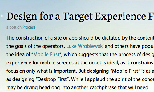 Another interesting perspective on a responsive designer’s workflow; Nathan C. Ford focuses on experience of its users first and then derives user scenarios and media queries from it. “There are goals for sites that reach beyond simple readability, where a lack of features can actually diminish the experience. I am working on such a project now. Our approach has been to peruse the research and tailor an optimal experience for the most likely user scenarios. Working out from there, we judicially edit and hone for each media query.”