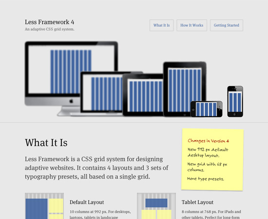 A CSS grid system for creating adaptive layouts. It includes four basic layouts (including tablet, mobile and wide mobile), with three sets of typography presets.
