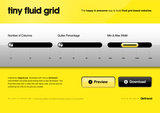 Tiny Fluid Grid helps you generate your own fluid grid with 12, 16 or 24 columns, minimum and maximum widths, and percentage-based gutters.