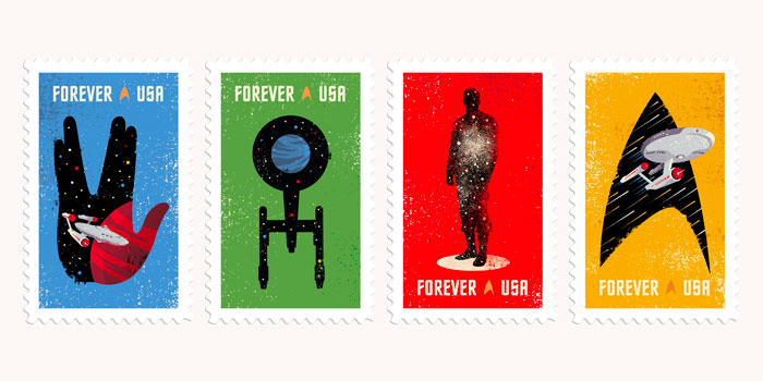 In order to celebrate the 50th Anniversary of the original Star Trek television series on CBS, the Philadelphian design studio ‘The Heads Of State’ created these stamps. Large view here.